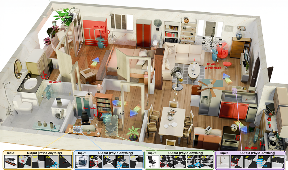 PhysX-Anything generates simulation-ready physical 3D assets from a single image, producing not just shape but also explicit geometry, articulation, and physical attributes so the assets can be used directly in simulation and embodied AI; it also introduces a more efficient geometry representation and the PhysX-Mobility dataset with 2K+ real-world objects to support this task.